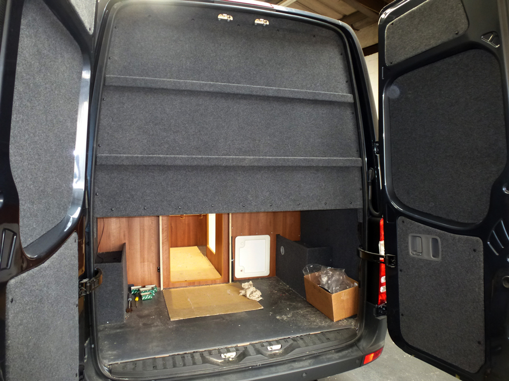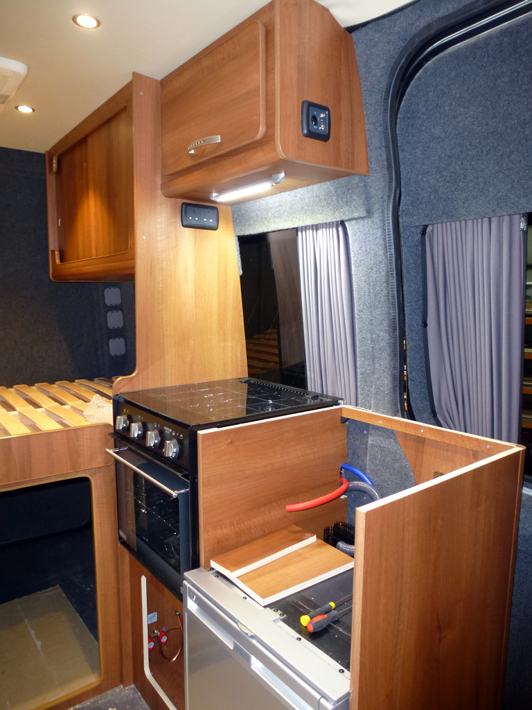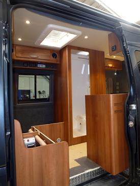 The gas cooker has three full sized rings. The oven has two cooking levels as well as a top grill. Below the cooker is another good sized cupboard. Access to the boot is gained through the internal door as well as from the rear of the vehicle meaing that in adverse weather it is not necessary to go outside.